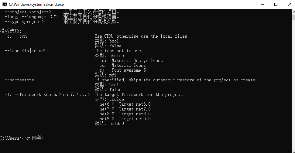 每个模板都提供了相应的模板选项,可以通过 dotnet new <模板名称> -h