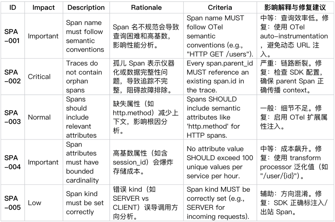 2. TraceSpan 规则(SPA-XXX):评估追踪 Span 完整性和规范