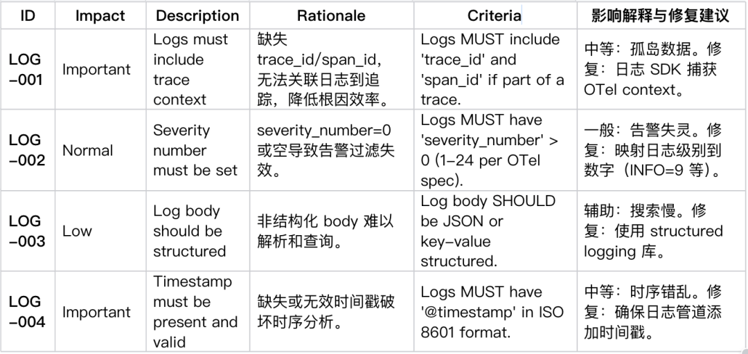 4. Log 规则(LOG-XXX):评估日志结构和关联
