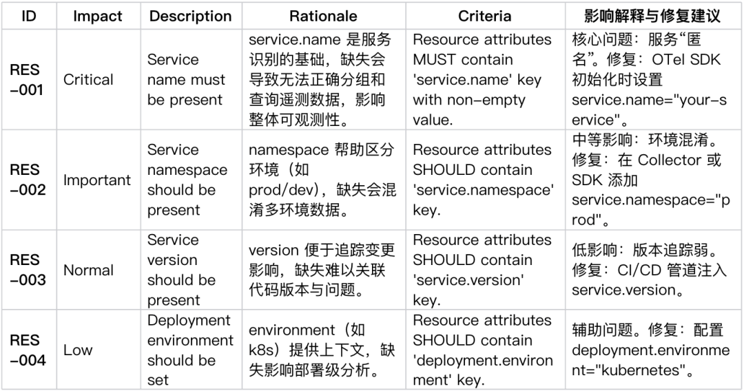 这些规则确保资源属性(如 service.name)完整,用于服务识别和分组。