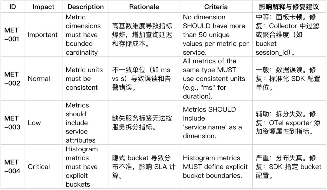 3. Metric 规则(MET-XXX):评估指标维度和一致性