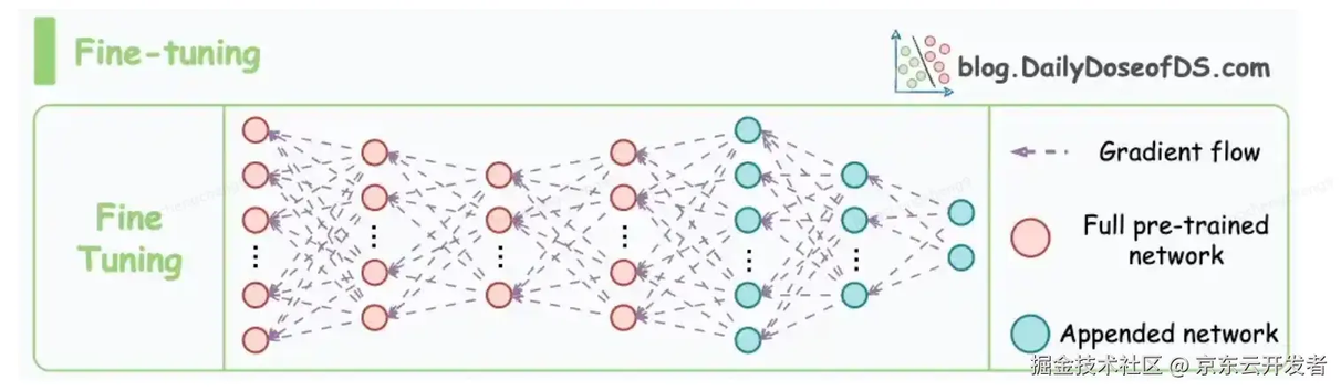 传统的微调(如下图所示)对于 LLM 来说是不可行的,因为这些模型具有数十亿个参数并且大小为数百 GB,并且并非每个人都可以使用这样的计算基础设施。