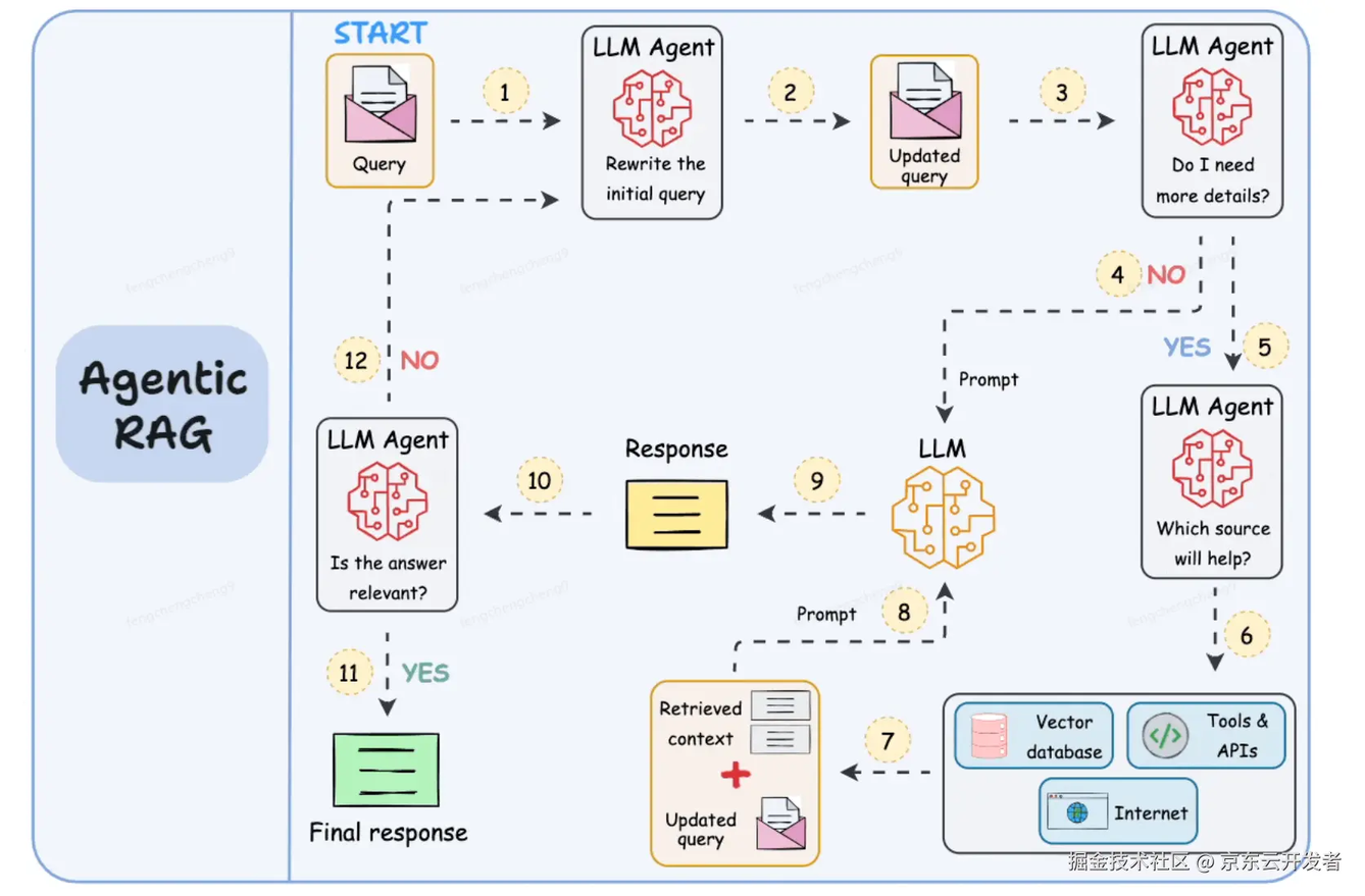 步骤 5-8) 如果答案是肯定的,另一个代理会查看其可以访问的相关资源(矢量数据库、工具和 API 以及互联网),并决定哪个资源有用。检索相关上下文并将其作为提示发送给 LLM。
