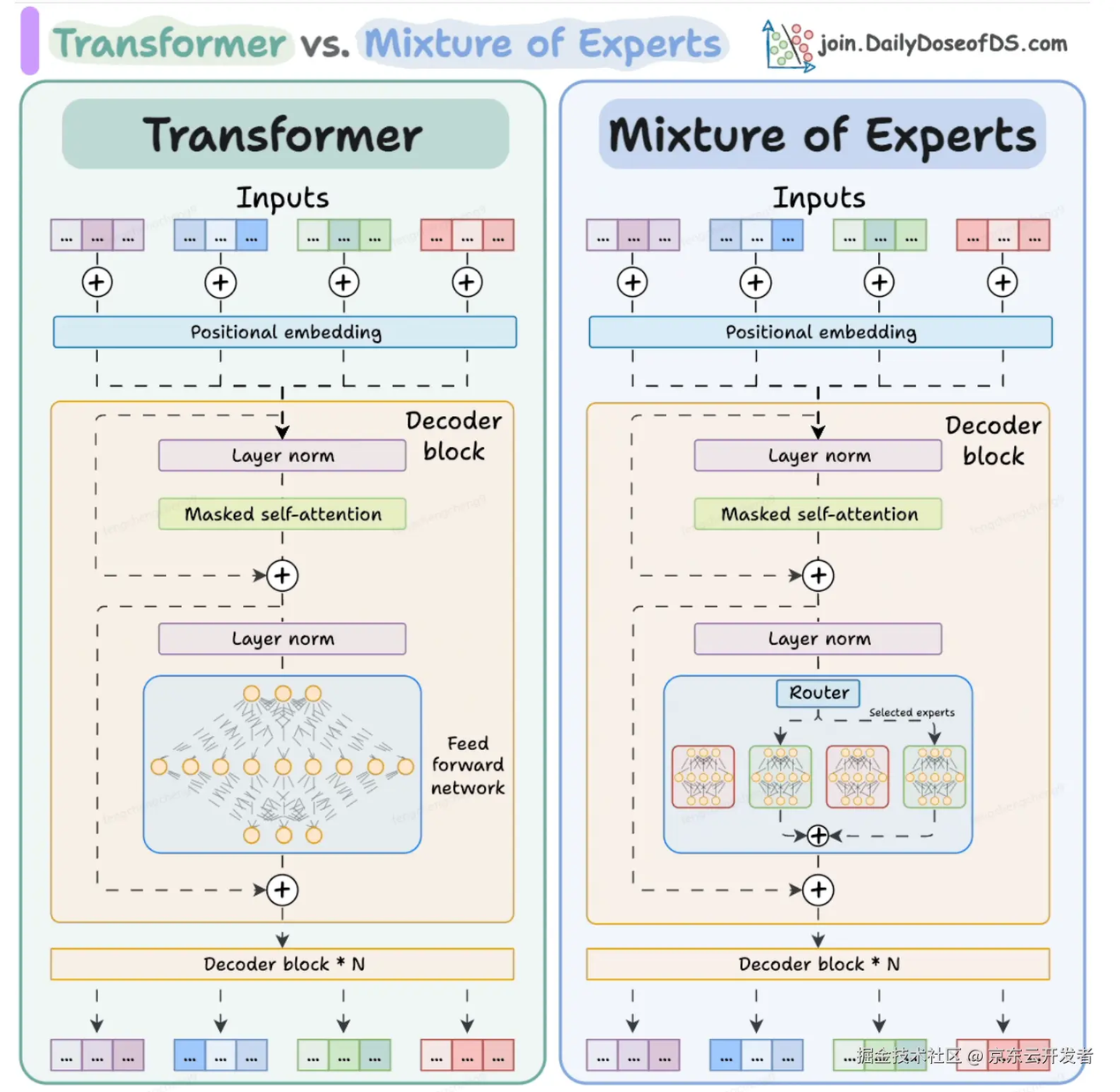 MoE 使用专家,它们是前馈网络,但与 Transformer 中的网络相比规模较小。在推理过程中,会选择一部分专家。这使得 MoE 中的推理速度更快。