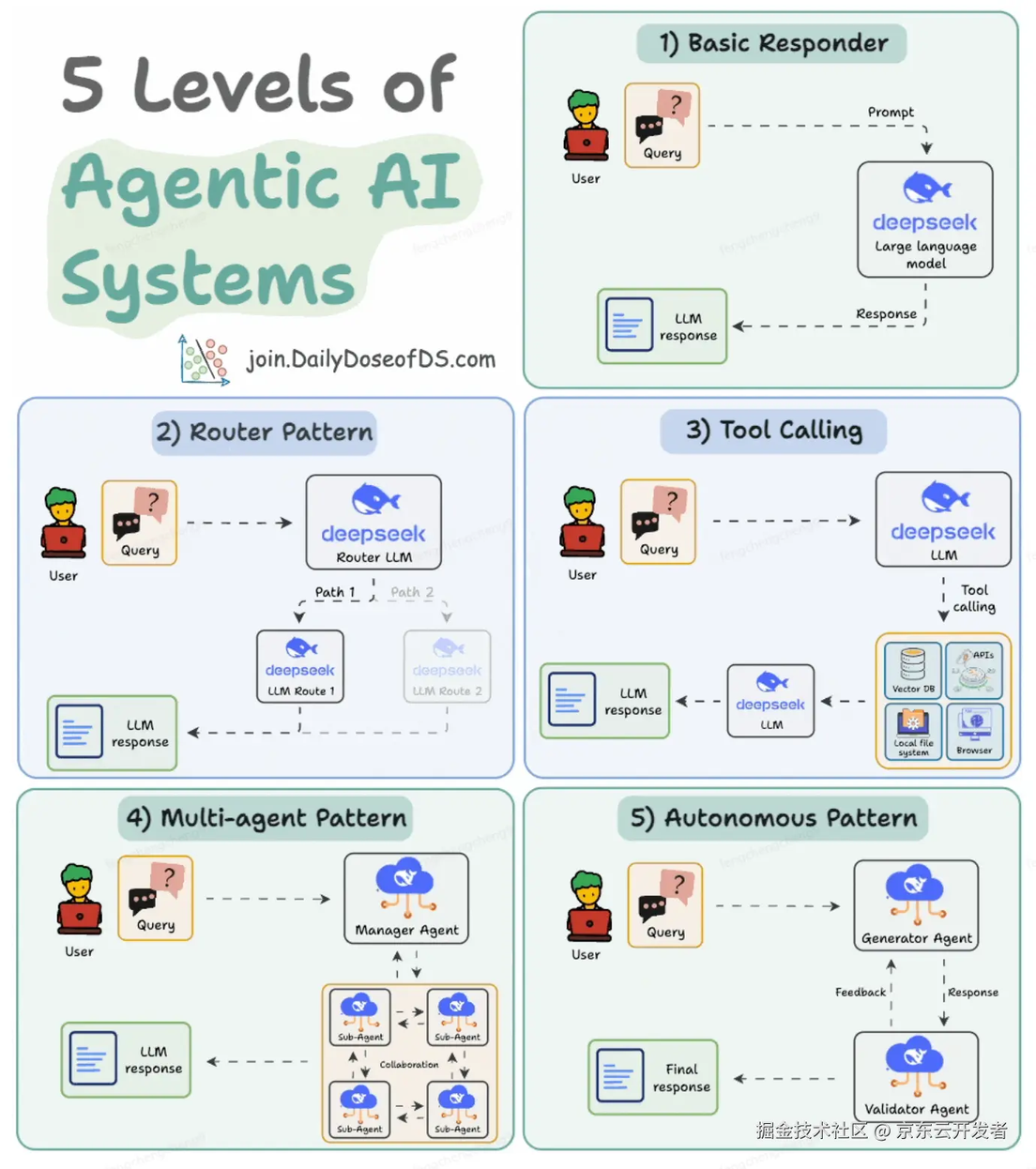 该图解释了人工智能代理的 5 个级别——从简单的响应者到完全自主的代理。
