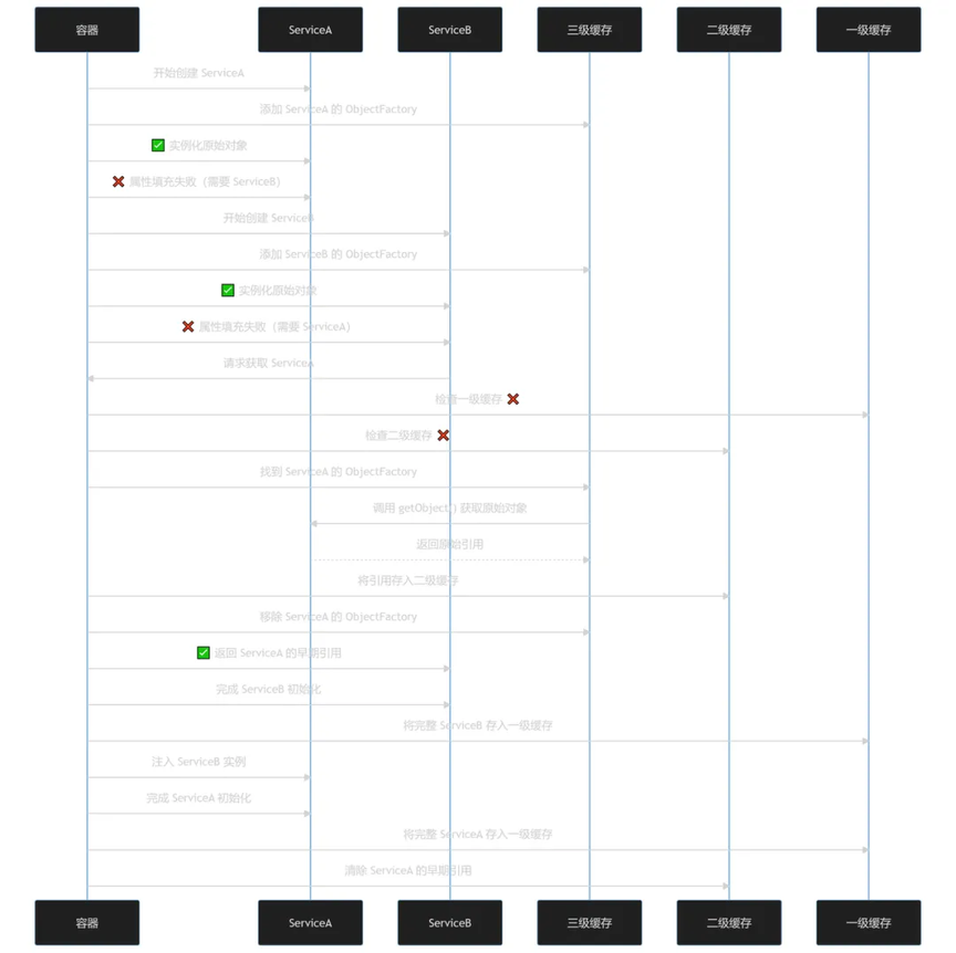 问题:在 Bean 的创建过程中(比如在填充属性 populateBean 时),ServiceA 还没创建完,它本身不应该被放入"已完成"的一级缓存。但如果 ServiceB 需要 ServiceA,而一级缓存里又没有 ServiceA 的半成品,ServiceB 就无法完成创建。这就回到了上面的死循环问题。