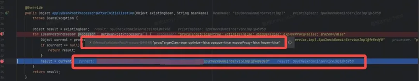 从红框 1 里面的两个引用看,很明显调 initializeBean 方法时 spring 有对 spuCheckDomainServiceImpl 做代理增强。导致 initializeBean 后返回的引用和提前暴露到二级缓存的引用是不一致的。这里 spuCheckDomainServiceImpl 有二级缓存是跟我们前面分析的吻合,是因为 spuCheckDomainServiceImpl 被获取了两次,即调了两次 doGetBean。
