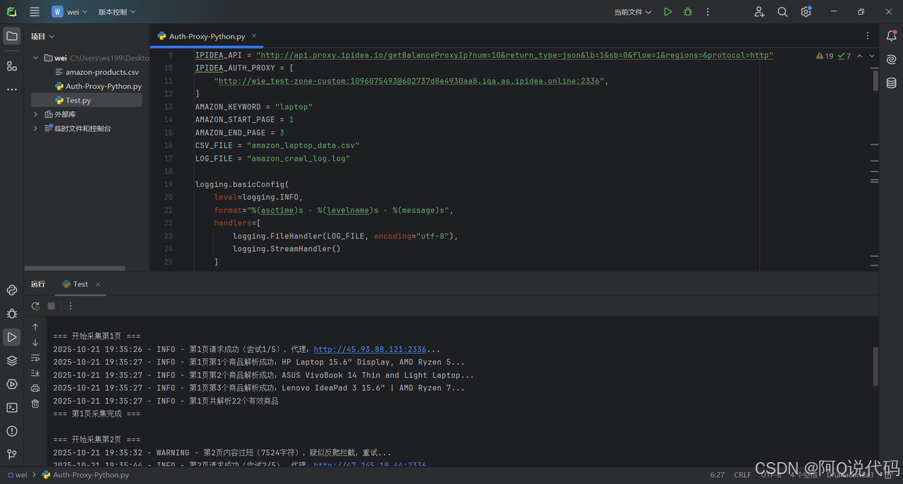 IPIDEA_API = "http://api.proxy.ipidea.io/getBalanceProxyIp?num=10&return_type=json&lb=1&sb=0&flow=1®ions=&protocol=http"IPIDEA_AUTH_PROXY = [ "http://wie_test-zone-custom:1096075493@602737d8e4930aa8.iqa.as.ipidea.online:2336",]AMAZON_KEYWORD = "laptop"AMAZON_START_PAGE = 1AMAZON_END_PAGE = 3CSV_FILE = "amazon_laptop_data.csv"LOG_FILE = "amazon_crawl_log.log"