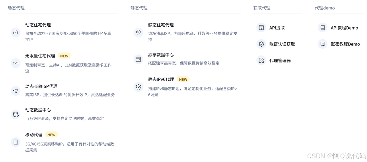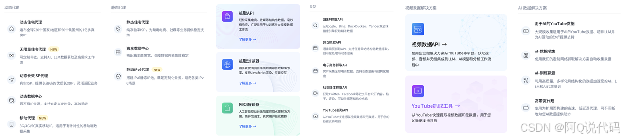 ✅IPIDEA 视频·AI 双引擎:一端高效提取 YouTube 等平台音视频数据,另一端提供 AI 专属采集与训练支持,助力智能场景快速落地✅IPIDEA 全场景抓取体系:以抓取 API、抓取浏览器与网页解锁器为核心,覆盖 SERP、电商、社交等多领域数据源,全面适配全球主流平台✅IPIDEA 代理服务矩阵:集动态与静态代理于一体,支持 API 与账密多种接入方式,为全球化数据采集提供稳定、安全的 IP 支撑