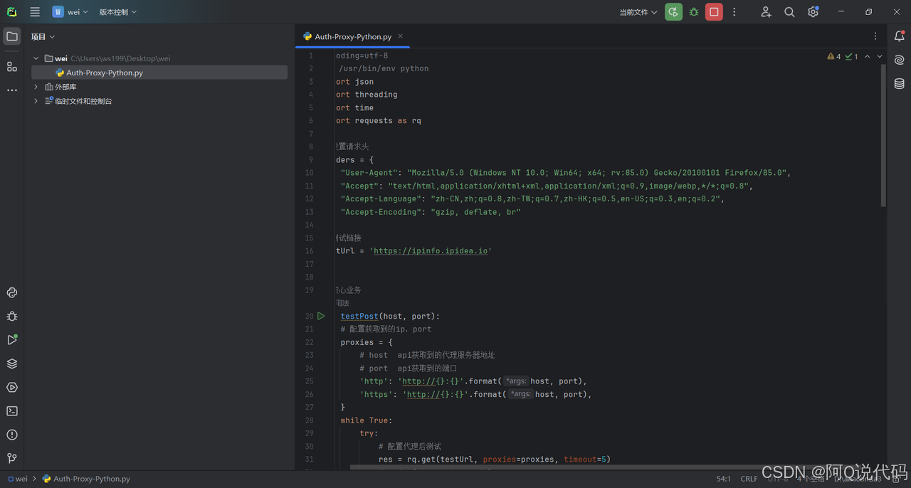 # 核心业务def testPost(host, port): # 配置获取到的ip,port proxies = { # host api获取到的代理服务器地址 # port api获取到的端口 'http': 'http://{}:{}'.format(host, port), 'https': 'http://{}:{}'.format(host, port), } while True: try: # 配置代理后测试 res = rq.get(testUrl, proxies=proxies, timeout=5) # print(res.status_code) # 打印请求结果 print(res.status_code, "***", res.text) break except Exception as e: print(e) break return