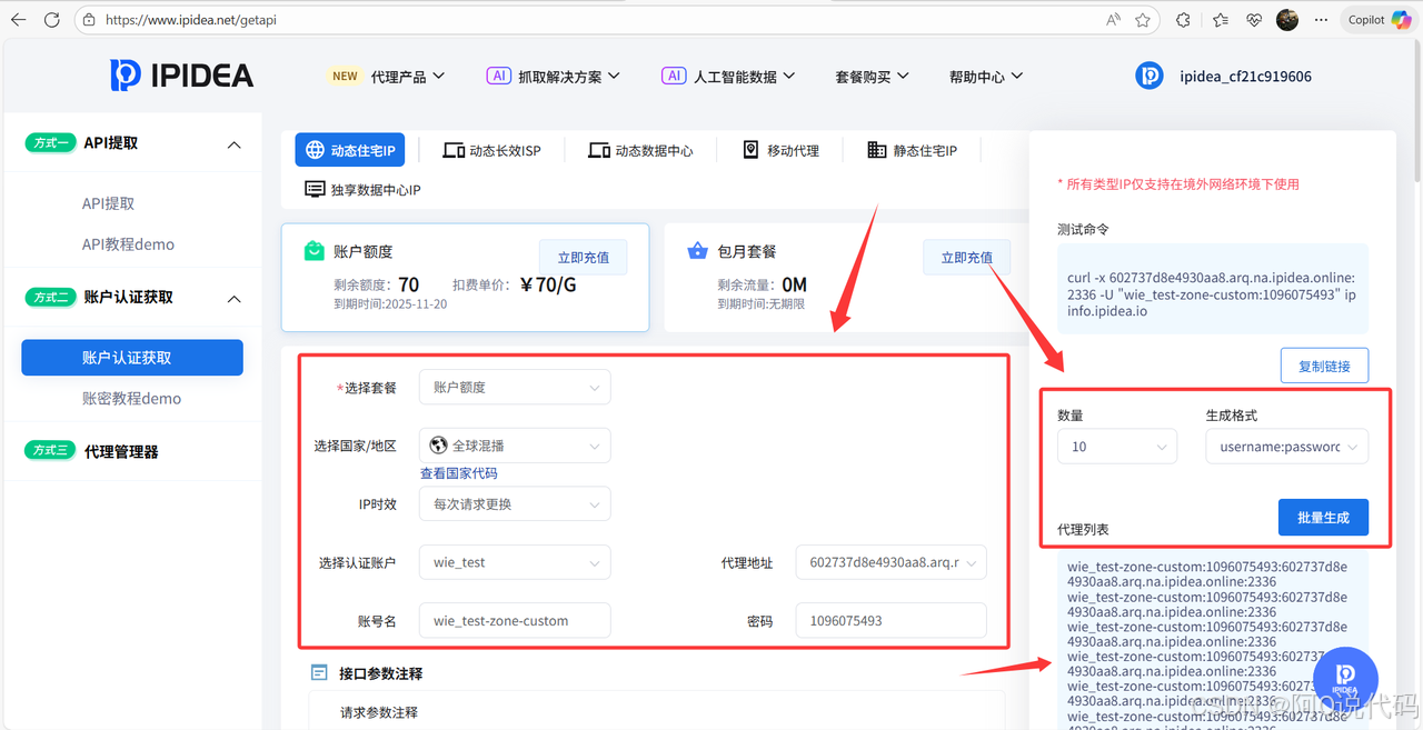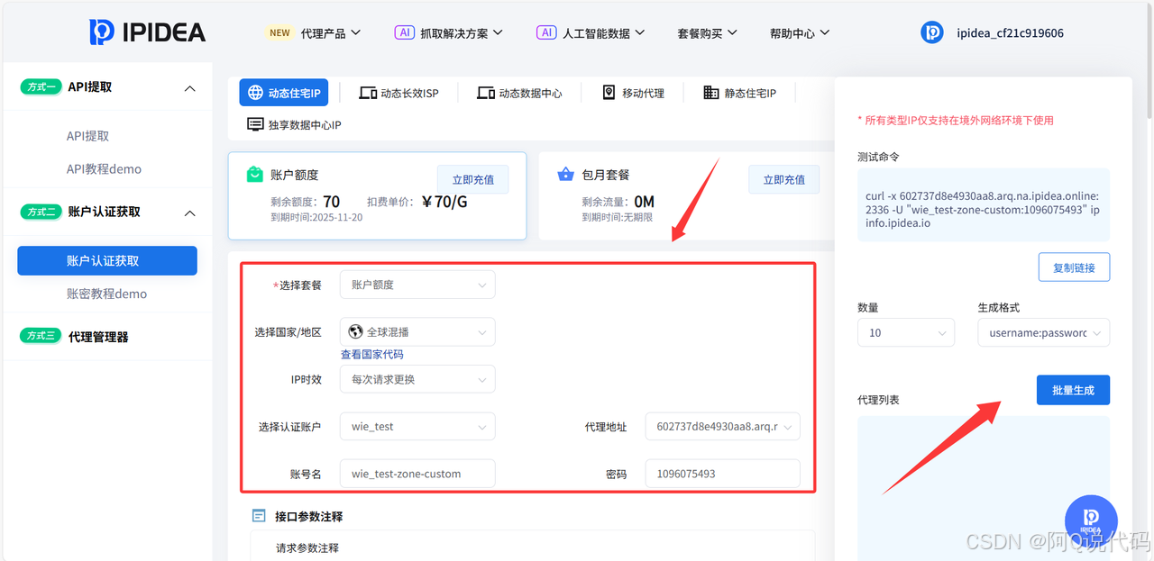 1、此处需要选择认证账户处需要自己创建认证账户,然后保存生成的账号名、密码、代理地址