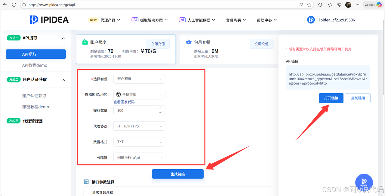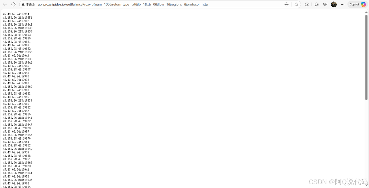 def get_ipidea_proxy_from_api(): try: response = requests.get(IPIDEA_API, timeout=10) response.raise_for_status() data = response.json() if data.get("code") != 0 or not data.get("success"): error_msg = data.get("msg", "API返回未知错误") logging.error(f"IPIdea API请求失败:{error_msg}(请检查API参数/添加白名单,IP:{data.get('request_ip')})") return [] proxies = [f"http://{ip_port}" for ip_port in data.get("data", [])] logging.info(f"从API成功提取{len(proxies)}个IPIdea代理") return proxies except Exception as e: logging.error(f"IPIdea API调用异常:{str(e)},将使用备用账密代理") return []