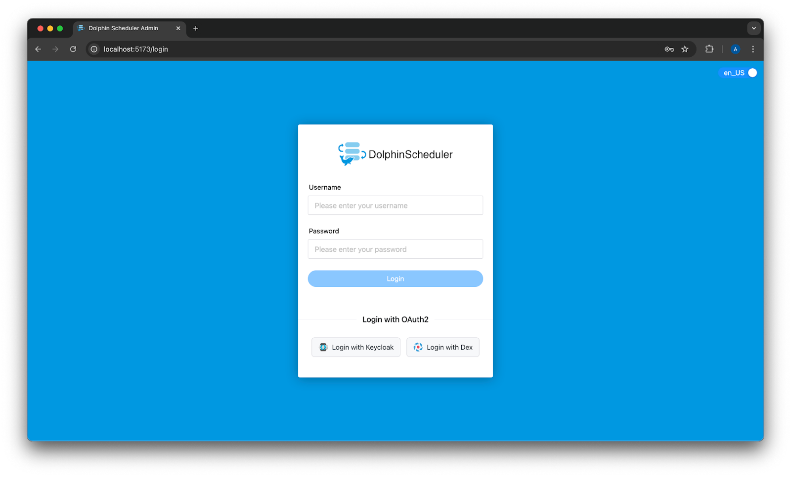 重启 DolphinScheduler API 服务器之后,登录页面就会出现 “Login with Keycloak” 和 “Login with Dex” 按钮。