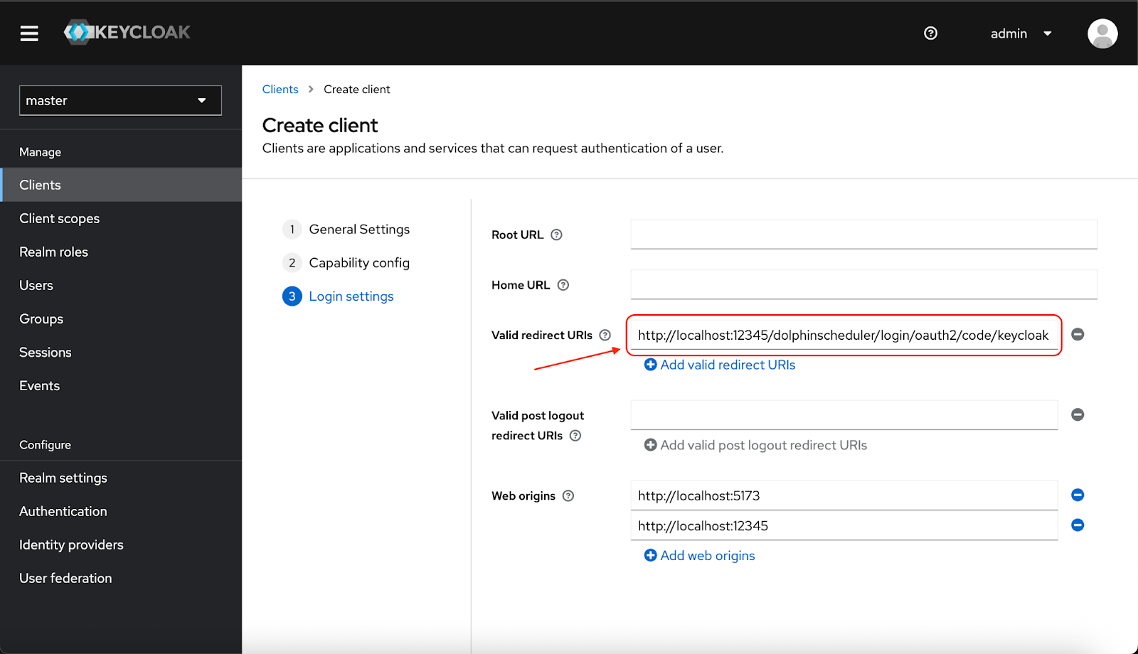http://{api - host:port}/dolphinscheduler/login/oauth2/code/{provider - id}。要是本地搭建的环境,就是http://localhost:12345/dolphinscheduler/login/oauth2/code/keycloak。
