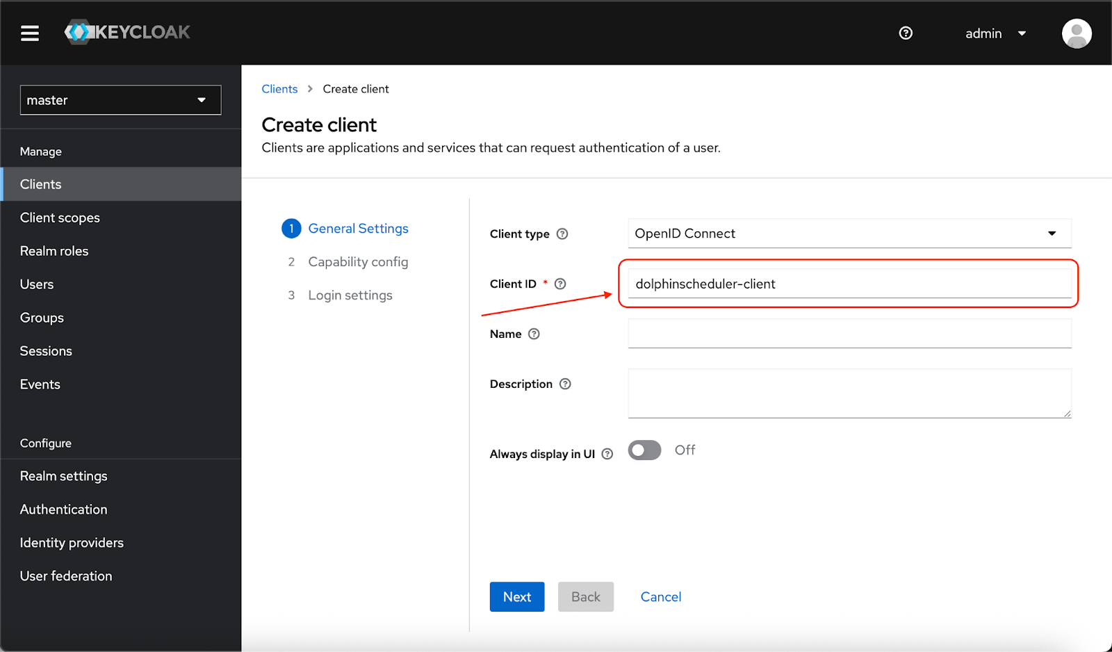 在 Keycloak 实例里,得把 DolphinScheduler 注册成新客户端。