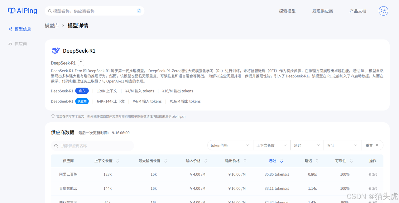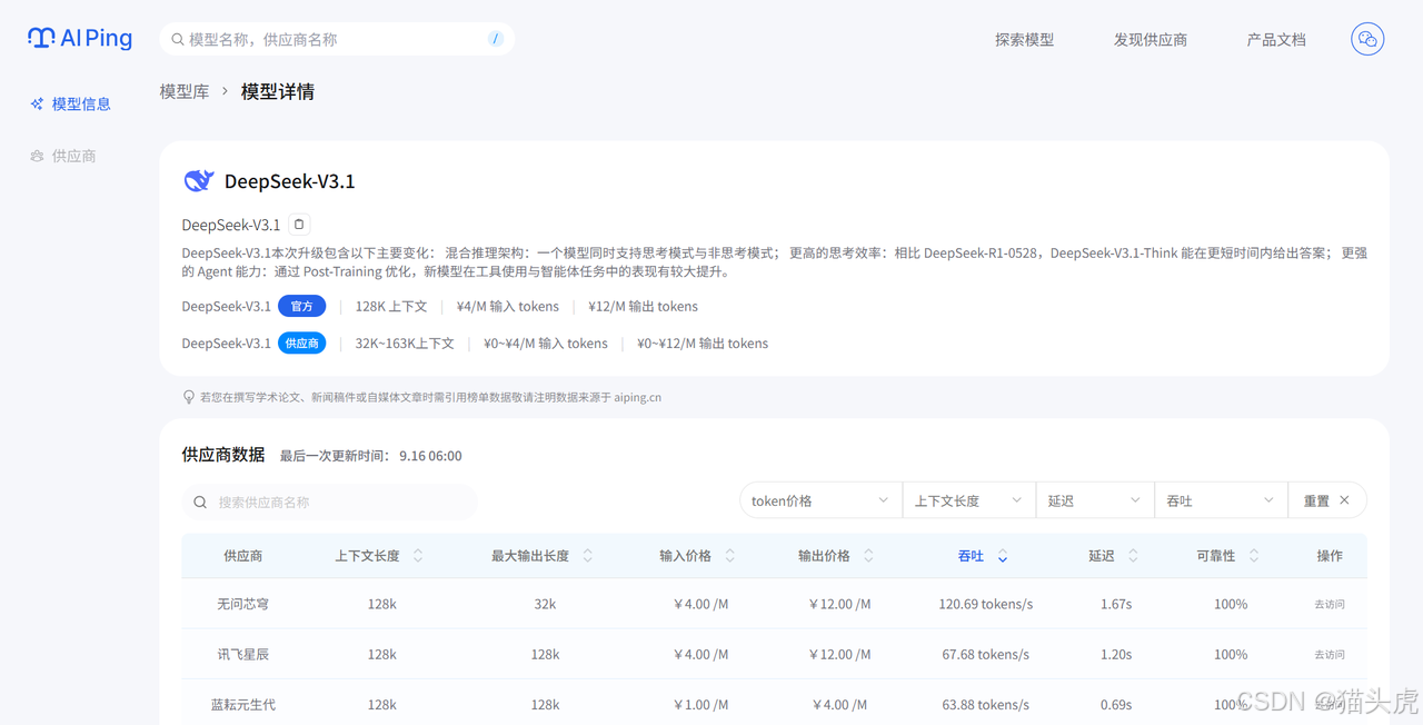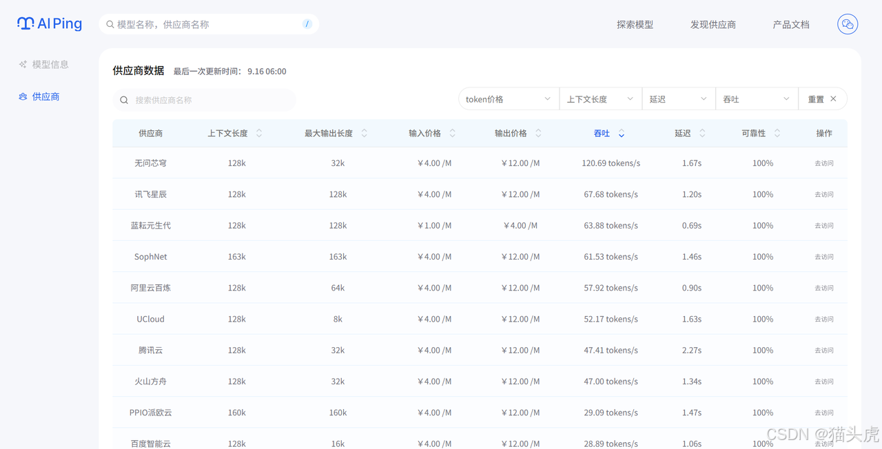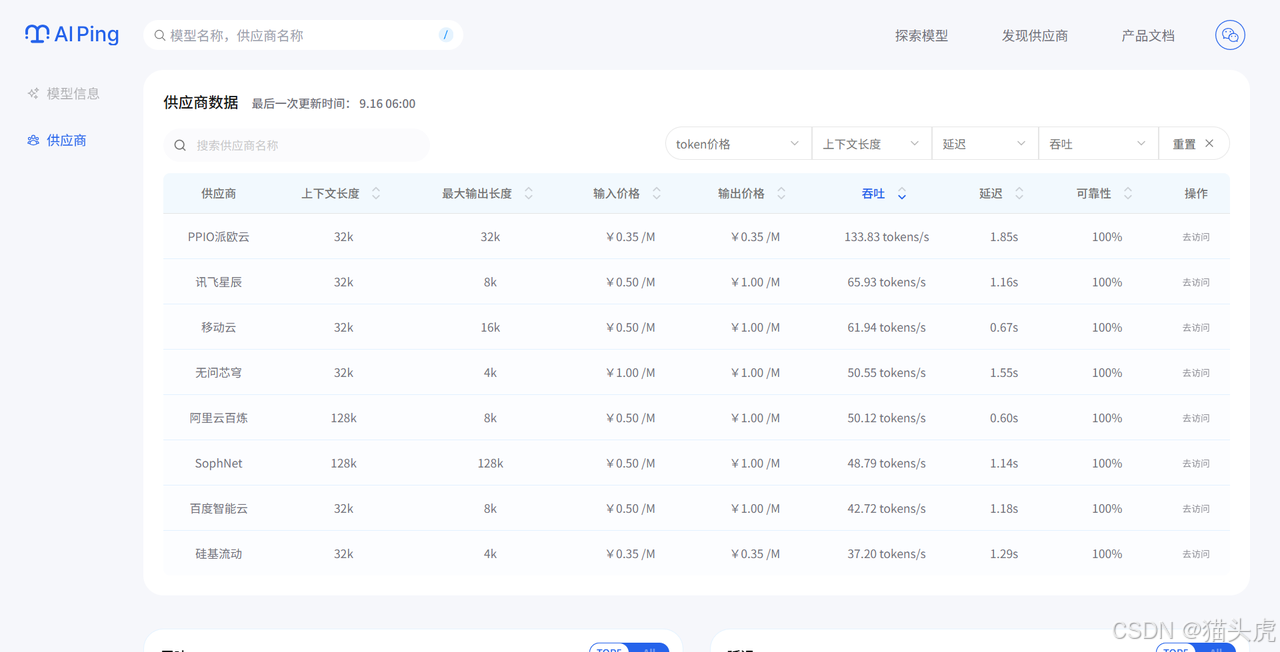 AI Ping 平台围绕延迟、吞吐、可靠性、价格、上下文长度、最大输出长度等六大核心指标,构建了全方位的评测体系。平台通过自动化脚本,定时对接各大主流 MaaS 平台 API,采集真实调用数据,确保评测结果的客观性和可复现性。同时在每个供应商的最后还提供了访问接口。