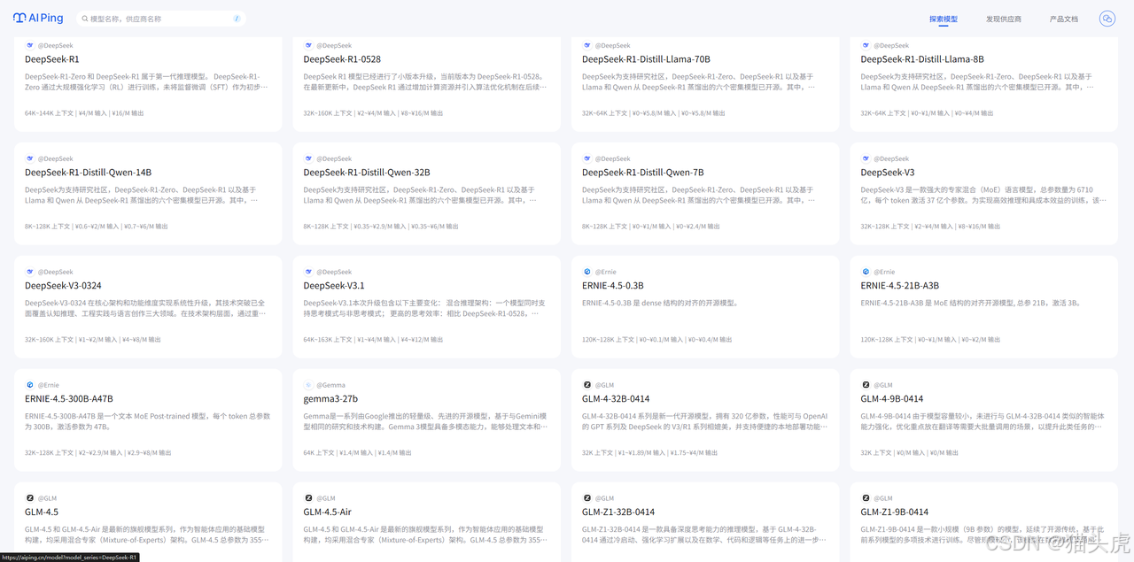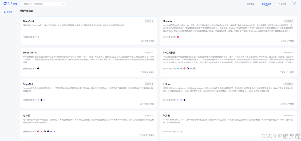 AI Ping 平台已集成了国内外主流的 21 家 MaaS 供应商,涵盖了绝大多数市场主流模型服务。用户无需再分别访问各家官网、查阅文档,只需在 AI Ping 平台即可一站式浏览和对比所有主流供应商的模型性能、价格和服务能力,大大提升了选型效率。