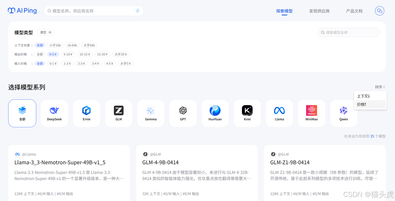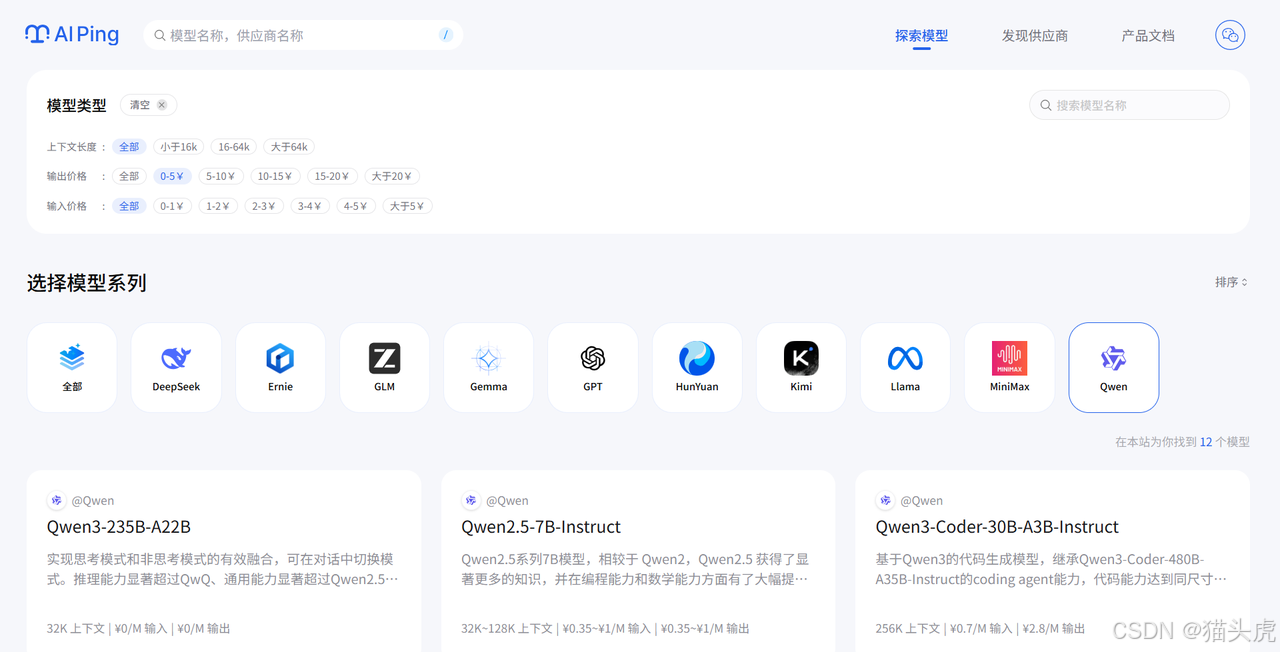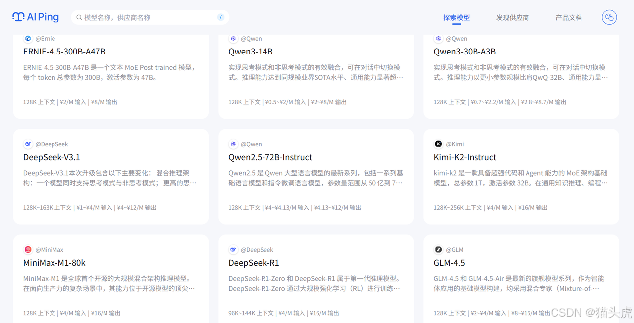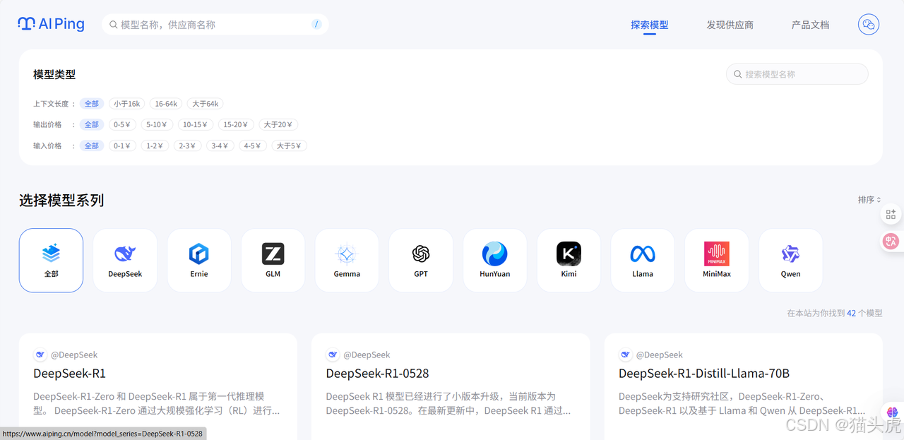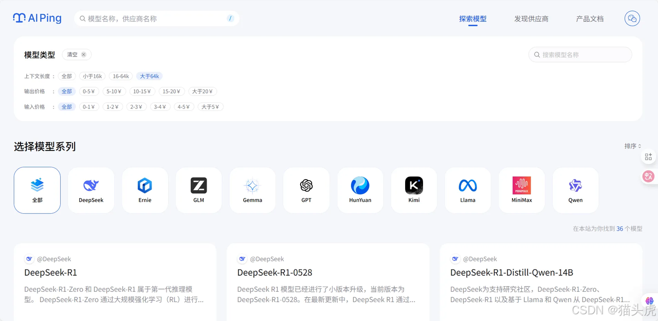 访问AI Ping官网:https://aiping.cn/?utm_source=cs&utm_content=k,点击顶部的探索模型,这里提供了模型的筛选功能。