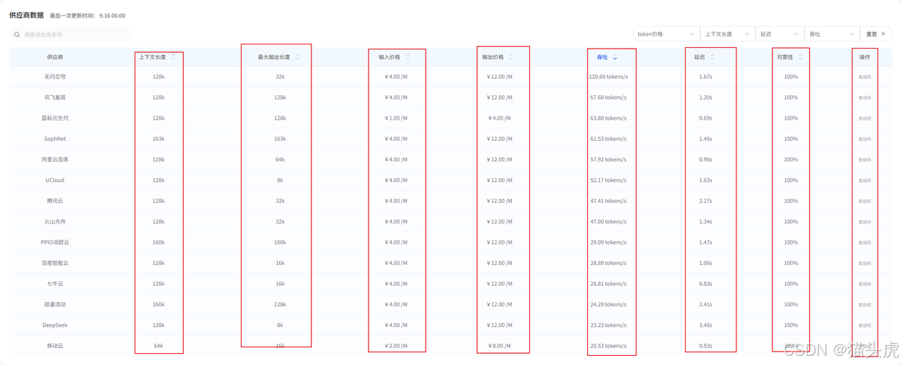 查看下方的供应商表格,对于长文本任务,吞吐量(Tokens/s) 变得很重要,因为它直接影响处理速度。对比不同供应商提供的 “吞吐量” 和 “价格”,选择一个处理速度快且稳定的供应商。
