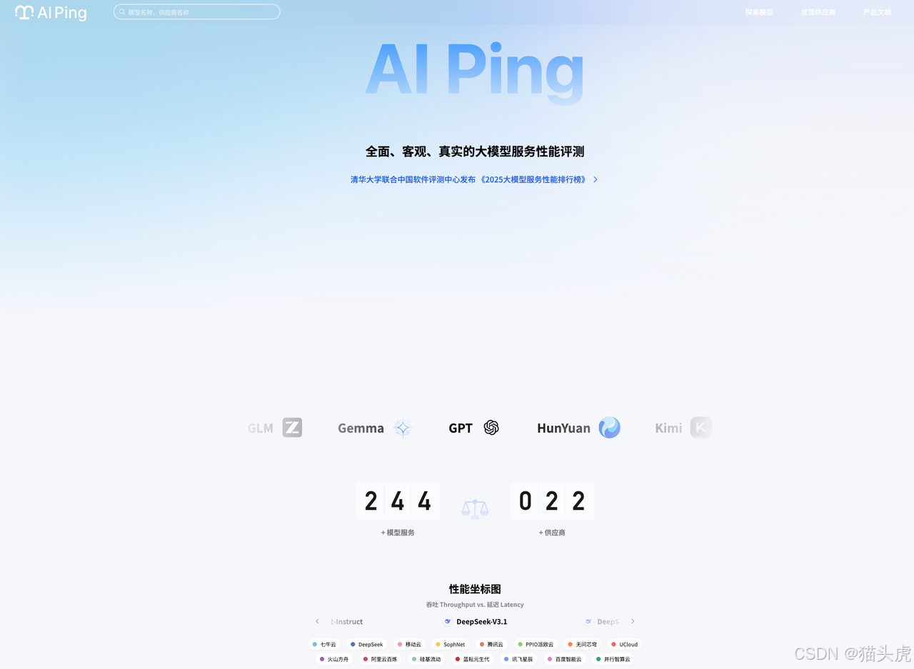 AI Ping 是一个面向大模型使用者,提供全面、客观、真实的大模型服务评测平台。平台聚焦于为企业和开发者提供客观、中立、持续的大模型服务性能对比数据,帮助用户科学选型,避免“盲人摸象”式的决策。进入首页可以看到页面整体简洁,直观,就连色彩也十分清爽。