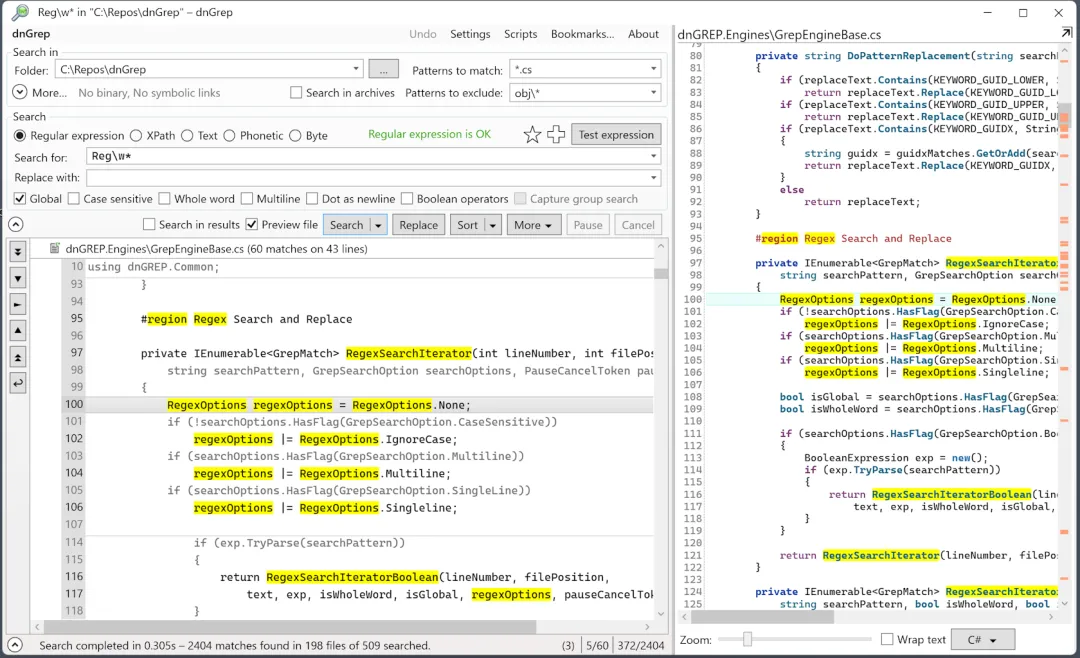 dnGrep 是一款基于 .NET 开源、功能强大的 Windows 搜索工具,它支持在多个文件中进行搜索,并以易于阅读的结果呈现。你可以通过文本、正则表达式、XPath 和语音查询搜索文本文件、Word 和 Excel 文档、PDF 文件以及存档文件中进行搜索。dnGrep 还提供了搜索和替换、整文件预览、在文件资源管理器中右键搜索等更多功能。