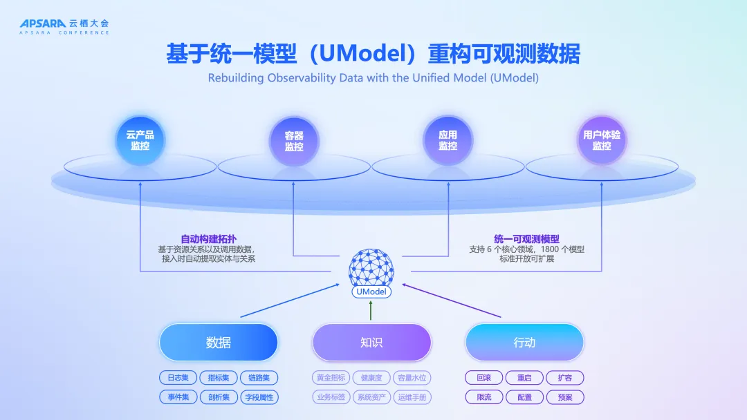 我们现在基于 UModel,已经覆盖了 6 大核心领域、创建了 1800 多个模型,并且这是完全开放可扩展的。我认为它真正的革命性在于,它重构了可观测世界的范式,将数据、知识、行动这三个核心要素绑定在了一起: