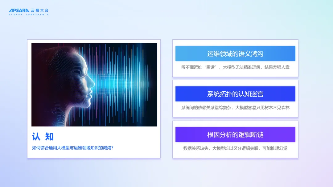 解决了数据问题,我们再来看 AIOps 面临的第二个、也是更深层次的难题 - 认知。从本质上是如何弥合大模型的通用智能与运维领域的专业知识之间的鸿沟。具体来说,我们会面临三大挑战: