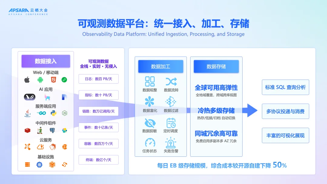 - 服务端,统一数据加工与存储,以应对洪流:SLS 具备全球可用的高弹性高可靠架构,能承载每日 EB 级的存储规模,秒级千亿行查询,数百亿行分析,百万时间线计算能力。通过丰富、灵活、强大的数据加工能力和存储冷热分层技术,在保障数据完整性的同时,将综合成本较自建方案降低 50% 以上。