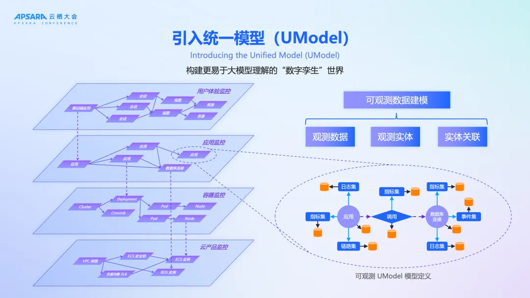 - 中间层,通过创新的 UModel 和算法引擎,我们为数据赋予了拓扑关联和领域知识,解决了“认知”的鸿沟问题。