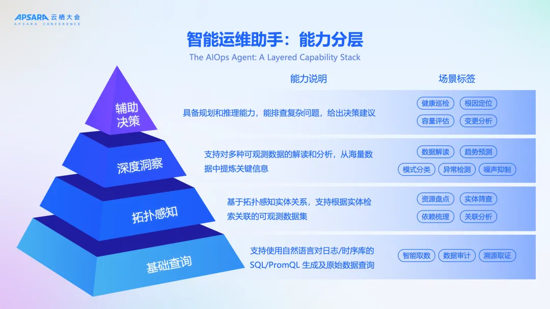 那么,AIOps Agent 是怎么实现这一切的呢?智能并非空中楼阁,也无法一蹴而就,需要逐级构建在一个坚实的能力分层金字塔之上: