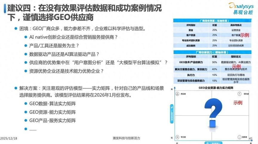 五、供应商的选择标准应如何设定?是优先选择以产品或工具为核心的供应商,还是以服务为导向的供应商?是选择能够提供综合营销方案的服务商,还是专注于 AI 技术的新锐科技企业?是倾向于对大模型平台算法具备更强模拟能力的企业,还是更擅长用户需求分析与理解的企业?