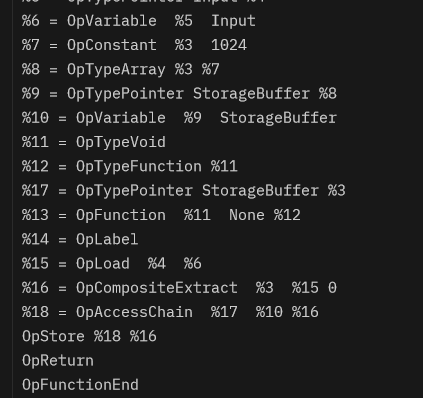 if let Symbol::Idx(obj, idx) = right { let obj = self.get(obj); if let Type::Array(ty, num) = obj.ty { let idx = self.get(idx); let ty_id = self.get_type((*ty).clone()); let ty_pt = self.builder.type_pointer(None, obj.cls, ty_id); let pt = self.builder.access_chain(ty_pt, None, obj.id, vec![idx.id])?;//然后向 ID装入值 let src = self.get(left); self.builder.store(pt, src.id, None, None)?; } else if let Type::Vec(ty, num) = obj.ty { if let Some(val) = self.get_const(idx) { let ty_id = self.get_type((*ty).clone()); } }复制代码