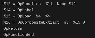 Symbol::Idx(obj, idx)=> { let obj = self.get(obj); if let Type::Vec(ty, num) = obj.ty { if let Some(val) = self.get_const(idx) { let ty_id = self.get_type((*ty).clone()); let id = self.builder.composite_extract(ty_id, None, obj.id, vec![val.val.as_u32().unwrap()]).unwrap(); Var{id, ty: (*ty).clone(), cls: StorageClass::Function} } else { panic!("") } } else { panic!("")}复制代码