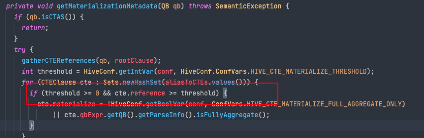 由于 with...as...等同于一个 SQL 片段,下文中会多次引用该片段的别名,相当于视图的味道。所以,这里面使用是一个虚拟的概念,实际上只是逻辑生效,实际运行是则是翻译成实际的 MR 逻辑去执行,如果下游引用该 SQL 片段较多,这时候 MR 执行会多次扫描原始数据,执行多次相同的 MR 操作逻辑,此时,就可以在第一次执行中来物化 CTE 写法中定义的 SQL 片段,从而达到优化的目的。在 hive 之前的版本中,该功能是默认关闭的,可以通过下面参数来开启,在新的 hive 版本中,该功能是默认开启,但是默认引用次数是 3 次。