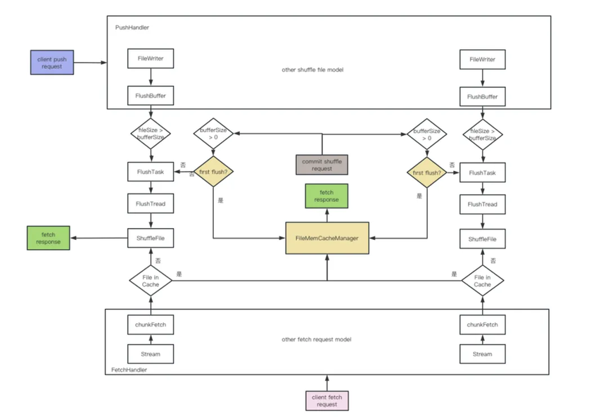 小文件缓存主要是通过增加一个 FileMemCacheManager 并作用在 shuffle 文件 commit 阶段实现,当服务端收到某个文件的 commit 请求时,会判断该文件是否之前有发生过刷盘操作,若没有且文件大小符合缓存策略,则会将文件缓存到 FileMemCacheManager 中去避免落盘。在 Shuffle 读取阶段,也会先校验文件是否被缓存,若缓存在内存中则从 FileMemCacheManager 中获取相应的文件数据,否则走原逻辑从磁盘中获取。