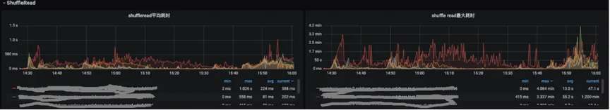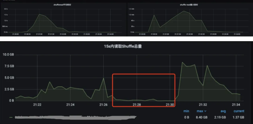 在日常运维中,我们频繁观察到 Shuffle Read 耗时异常波动的情况:读取耗时从正常的几十毫秒突然增加到秒级甚至分钟级,同时读取数据量呈现断崖式下降。这种现象在业务高峰期尤为明显,直接导致作业执行时间延长 30%以上。
