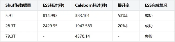 可靠性差异:ESS 在 79.3T 及以上 Shuffle 量时完全失败,而 Celeborn 能稳定完成所有测试案例