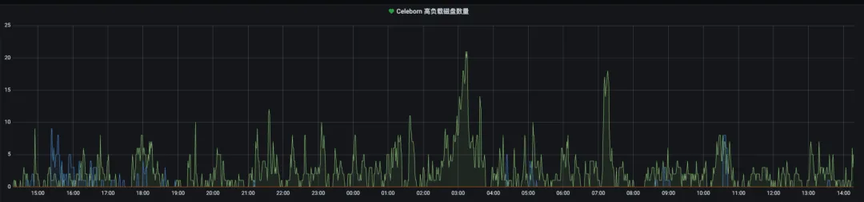 .discardDisk.maxWeight(默认配置 0.3)参数计算得来,其计算公式为集群磁盘总数 * celeborn.slots.assign.loadAware.discardDisk.maxWeight,例如我们总共有 500 块磁盘,按上述公式我们最多可能容忍 150 块磁盘不参与 slot 分配。对于高负载磁盘的判定,我们参考线上实际的平均读、写耗时阈情况将阈值设置为 200ms。通过引入上述策略,在凌晨高峰期时能及时剔除部分负载特别高的磁盘,防止 worker 持续恶化让服务性能更加稳定。