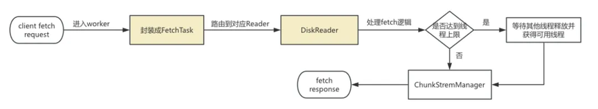 在设计方案上引入两个新的变量 FetchTask 和 DiskReader,FetchTask 主要用于把 fetch 请求的参数封装保留给到 DiskReader。而 DiskReader 则控制着单个磁盘读写并行度,每个磁盘对应一个 DiskReader,其不负责具体的 read 实现逻辑,read 逻辑还是在 ChunkStreamManager 中实现。