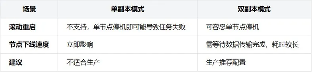 测试表明,双副本模式是生产环境的必选项,虽然节点下线需要更长时间等待数据传输完成,但保证了服务连续性。