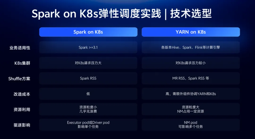 在此背景下,我们于 2023 年起与容器团队合作,启动了在离线混部项目,旨在探索将海量的大数据离线任务运行到 K8S 在线集群中。通过实现在线服务、大数据离线任务、与机器学习离线任务的混合部署,我们期望缓解计算资源的潮汐现象,实现资源的弹性伸缩和共享,增强大数据平台的资源供应,同时提升公司整体服务器的利用率并达到降本增效的目的。为实现上述混部效果我们对当前主流的方案 YARN on K8S 和 Spark on K8S 做了大量的调研,方案对比情况如下: