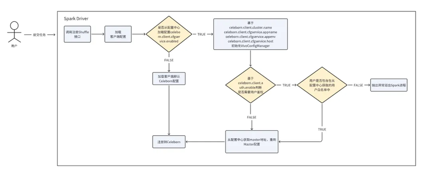 为了解决上述问题,我们在 Celeborn 客户端侧做了一些改造,用户接入 Celeborn 不再依赖 Mater URL 配置(spark.celeborn.master.endpoints),在客户端侧仅需要配置一个 Celeborn 集群标识,Celeborn 客户端会基于集群标识和用户账号向 VIVO 配置中心发起请求,通过配置中心获取真实的 Master URL